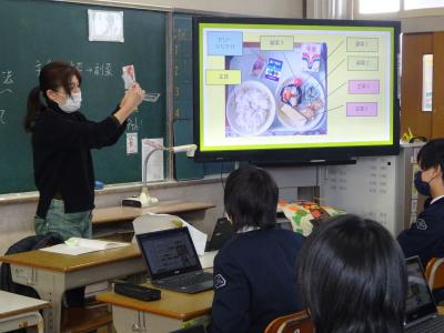 新型コロナウイルス感染症対策により、小学校最後の調理実習はかないませんでした。しかし、3学期に入り「まかせてね、今日の食事」の学習を栄養教諭茨木仁美先生としました。そして、「楽しく食事をするための工夫について考えよう」という課題のもと「あはは弁当」として2月8日、9日、10日の3日間で給食を弁当箱に入れました。お弁当はおいしく食べました。これで、遠足の時におかずを彩りよく自分で入れることができるね。