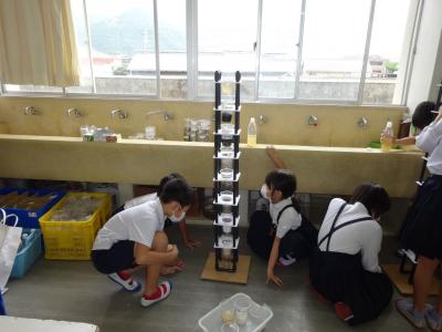 ろ過体験では、小石や砂、綿、紙、毛糸、スポンジなどを使ってろ過を行いました。どの組み合わせ、どの順番でろ過すれば水がきれいになるのかをグループに分かれて考えました。濁っていた水がきれいになって出てくるのを見て、とても驚き、感激していました。